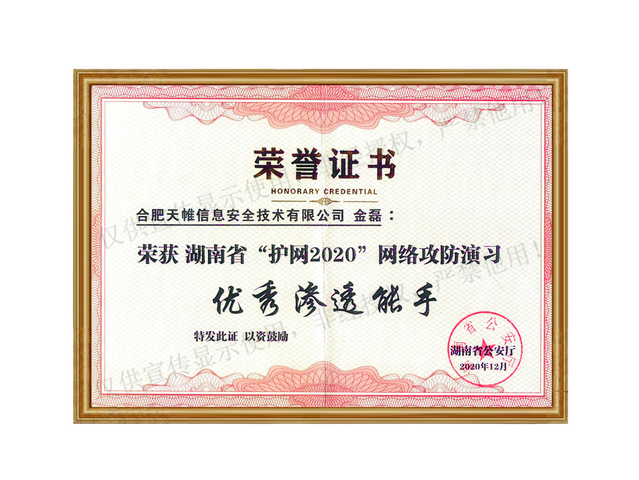 荣获湖南省“护网2020”网络攻防演习优秀渗透能手-金磊