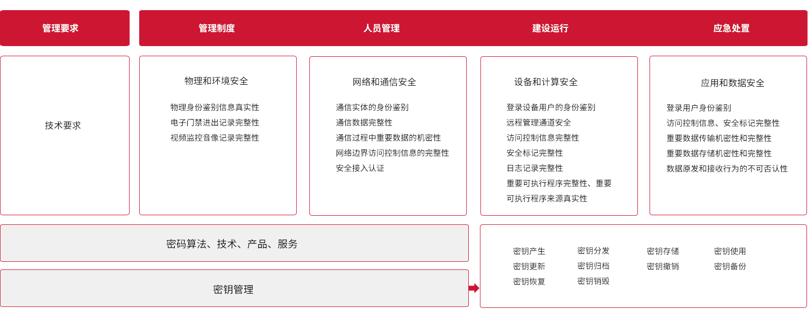 商用密码应用安全性评估主要对物理和环境、网络和通信、设备和计算、应用和数据、密钥管理以及安全管理六个方面进行评估。如下图所示: